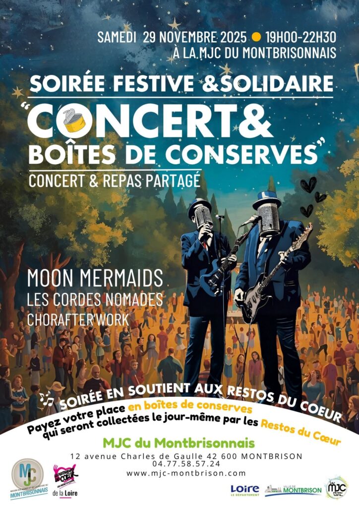 Le samedi 29 novembre 2025, la MJC du Montbrisonnais organise une soirée festive et solidaire intitulée “Concert & Boîtes de Conserves”, en soutien aux Restos du Cœur de la Loire.